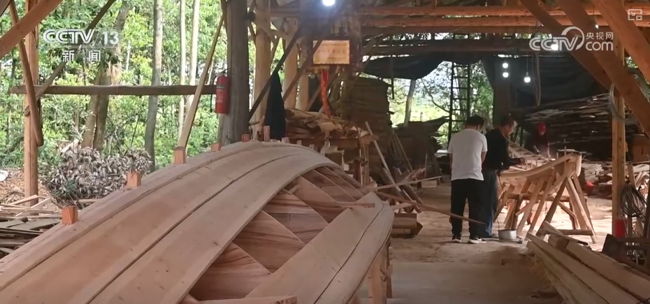正在浙江瑞安市安阳街道,一艘龙舟的舟身曾经制做完成。龙舟制制师傅正详尽地对舟身裂缝进行涂胶处置,而另一艘龙舟的制做也正在紧锣密鼓地进行着。