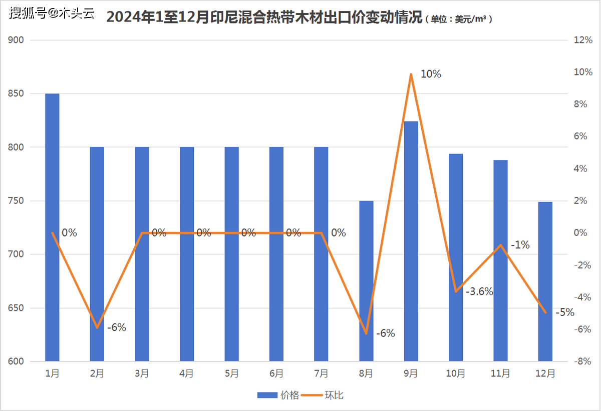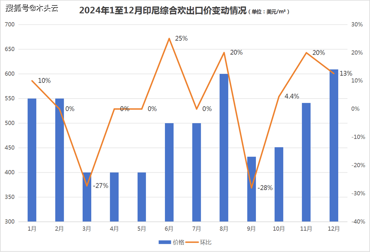 2024年印尼分析欢出口价表示较为波动,最低价呈现正在3月,环比下井27%至400美元/立方;最高价呈现正在12月,环比增加13%至609美元/立方。其余月份,如1月环比2023年12月增加了10%;6月以及11月均环比增加20%。