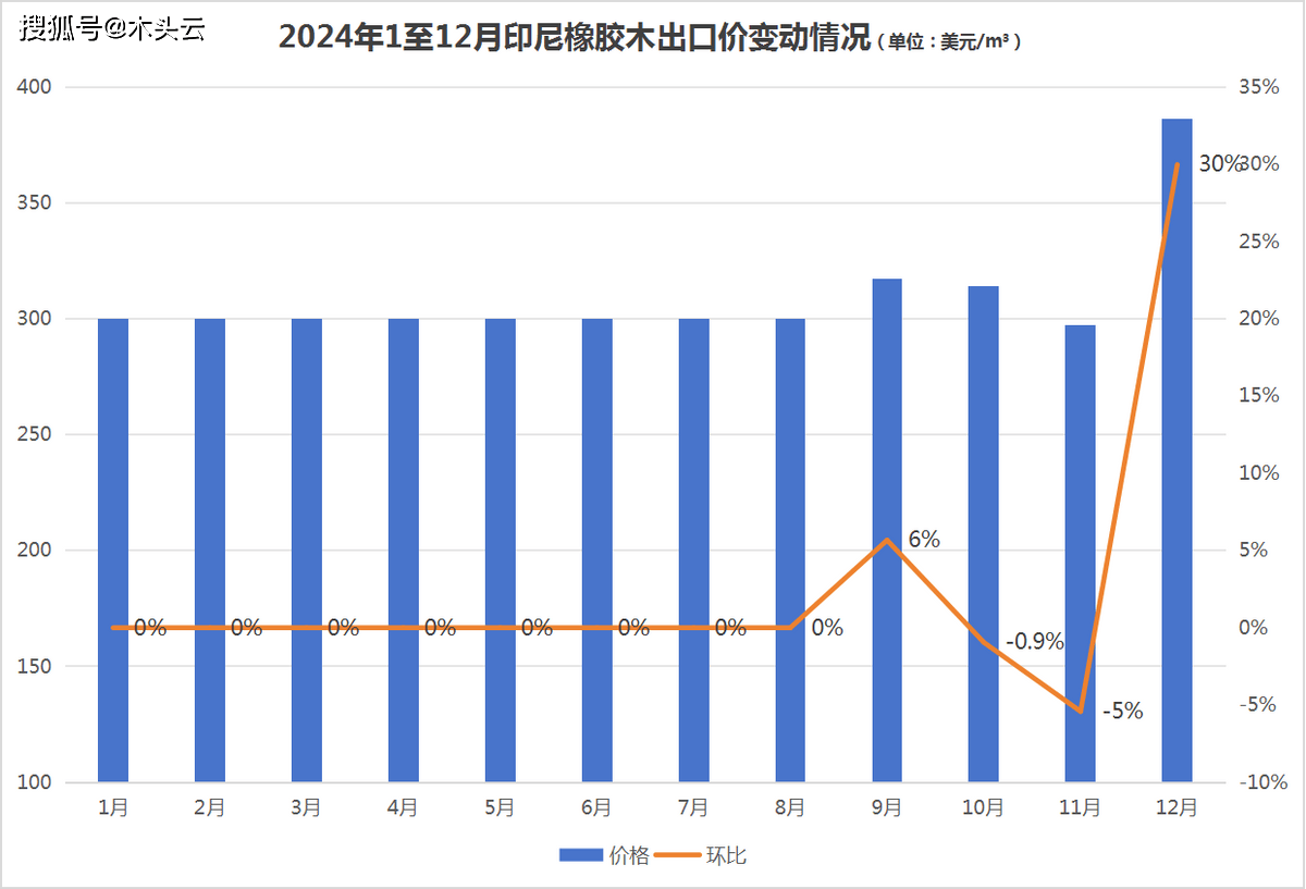 前8个月,印尼橡胶木出口价均维持正在300美元/立方的程度,9月出口价略微上调6%至317美元/立方,10月和11月持续下调,此中11月成为全年最大程度。猜测遭到泰国暴雨影响橡胶木原料供应,12月马来西亚橡胶木出口价达到全年最高程度,同比增加28。6%至386美元/立法,环比11月上涨了30%。
