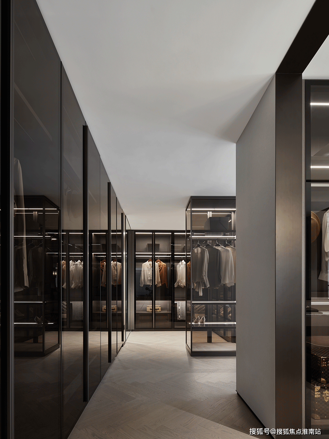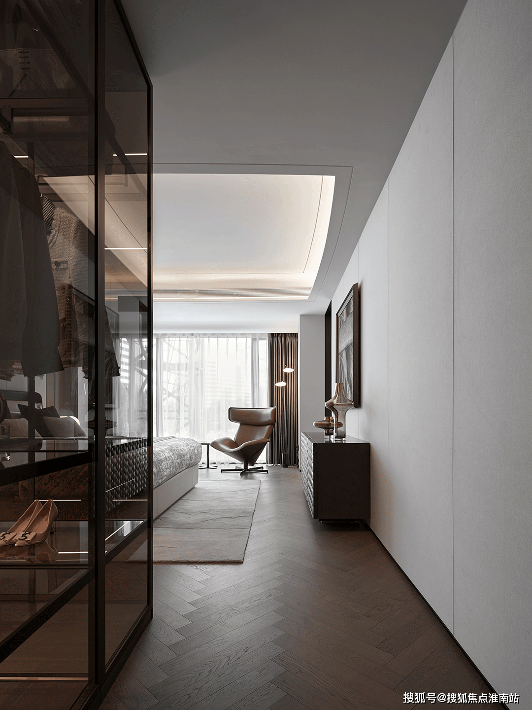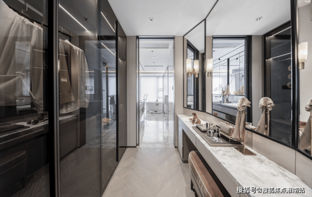 从从卧延长至从卫的步入式衣柜,赐与空间更强烈的布局感,对设想美学和功能从义的揉杂进行从头注释,也将精美糊口的幸福宗旨陈列而开。深色玻璃和金属边条的搭配,赐与一丝奥秘,透显露现逸内敛的调性。