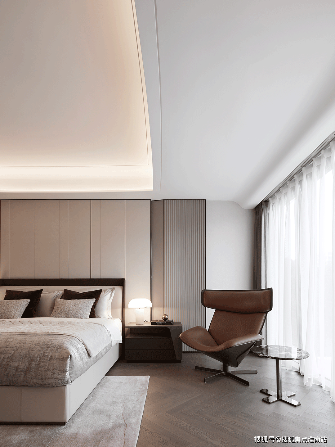 从卧正在走道里侧,确保了衡宇仆人的私密性,也带来一丝平稳,舒缓基调下,全体条理缓和过渡,线条和体块有序陈列,墙面布局的改变推导出视觉核心,橡木地板和墙布正在灯光衬托下,搭配出细腻温和的空气,窗前一张靠椅 一盏灯具,正在安宁的光阴中 寻得自由!