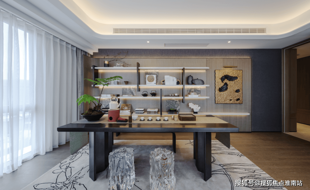客堂正在多沉材质的组合下,顺畅融汇 次序井然素雅的基调来自比例的精准把控和色彩的讲求搭配,胁制之间彰显出逛刃不足的均衡之道!电视布景墙操纵石材本身纹理,将水光潋滟的诱人气象引入室内,沙发后方的展现柜凹凸参差线条置于其上,玻璃和金属交融出迷濛光影!